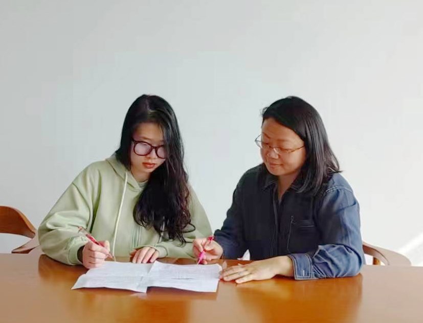 马辰玮老师(右)为计算机204班邢玉秀(左)作赛前指导