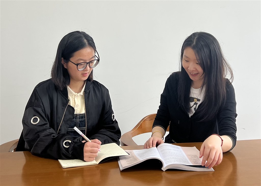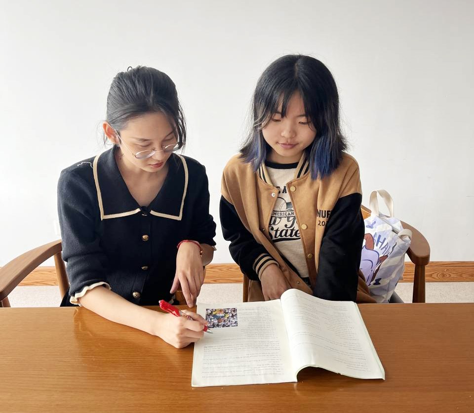 周玲琪老师(左)为社工211班李晨欣(右)作赛前指导