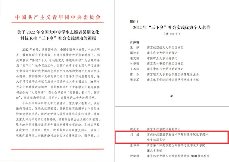 近日,团中央发布《关于 2022 年全国大中专学生志愿者暑期文化科技卫生“三下乡”社会实践活动的通报》,常州纺织服装职业技术学院的创意学院教师刘娟获评 2022 年全国“三下乡”社会实践优秀个人,江苏省共有11人获得该项荣誉。