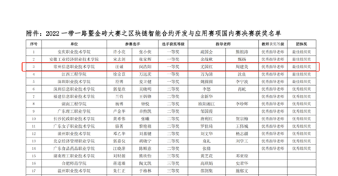 11月15日,2022一带一路暨金砖国家技能发展与技术创新大赛区块链智能合约开发与应用赛项以线上线下并行的方式举行,来自全国47所高校的47支队伍展开角逐。常州信息职业技术学院的软件与大数据学院尤国红、周建美老师指导的冯嘉琪、李聚源同学在比赛中以优异成绩获得比赛一等奖。