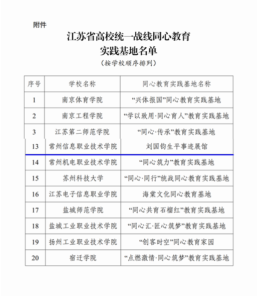 近日,省委教育工委公布了2022年江苏省高校统一战线同心教育实践基地名单,常州信息职业技术学院刘国钧生平事迹展馆获评“江苏省高校统一战线同心教育实践基地”。