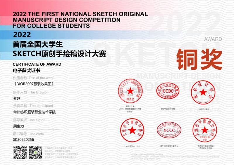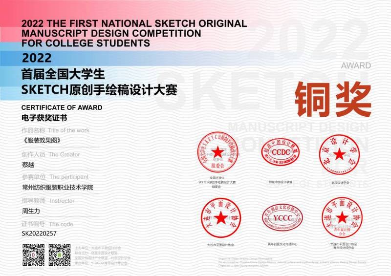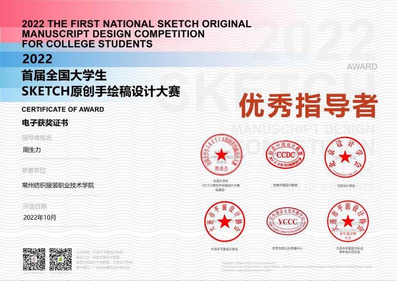 由创意中国设计联盟、全国文创设计产业联盟、北京设计学会、大连市平面设计协会联合主办,Y-DGDA青年设计师分会承办,携全国相关行业设计组织联合举办“首届全国大学生SKETCH原创手绘稿设计大赛”,自启动以来,受到全国高校和青年学子的积极响应,总计收到来自全国各省市高校投稿作品1934件,历经6个月于2022年11月圆满收官。经最终评选共产生金奖50件、银奖193件、铜奖386件。常州纺织服装职业技术学院的服装学院形象2031蔡越(指导老师:周生力)两件原创手绘稿作品获2项铜奖,周生力获指导教师奖。