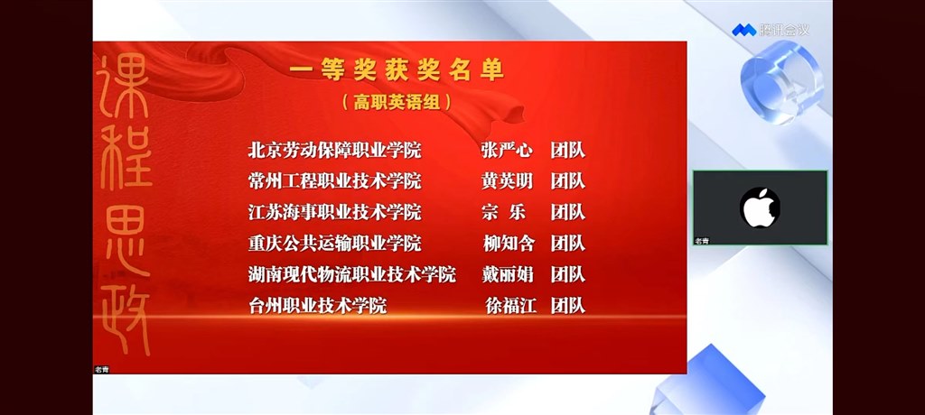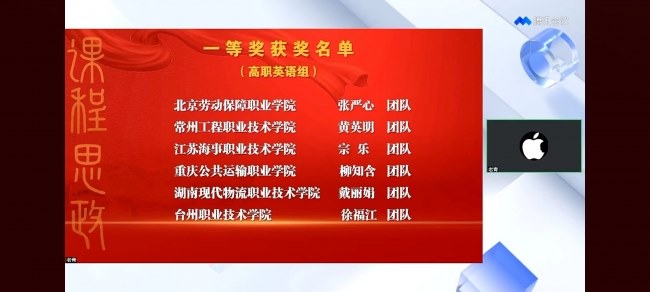 近日,全国高等学校外语课程思政教学大赛第三阶段赛事(国赛)在线上举行,常州工程职业技术学院通识部教师黄英明、娄立国、吴玥宁所组成的代表队作为江苏省4支代表队之一,从全国34支高职高专代表队中脱颖而出,喜获高职高专组一等奖。