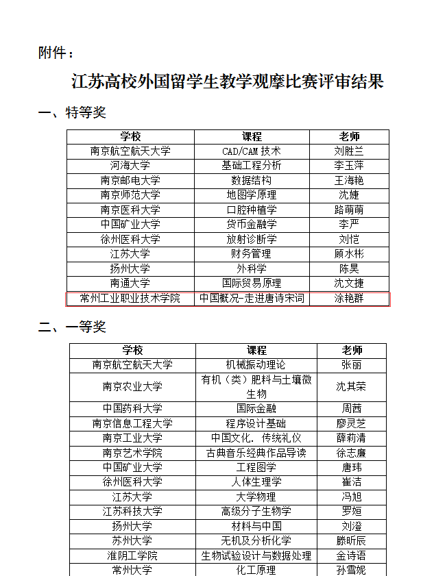 近日,从江苏省高等教育学会外国留学生教育管理研究委员会传来喜讯,常州工业职业技术学院教师涂艳群在江苏高校外国留学生教学观摩比赛中荣获特等奖。