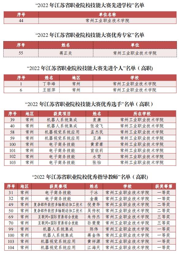 近日,江苏省职业院校技能大赛组委会发布了《关于公布 2022 年江苏省职业院校技能大赛先进地区等获奖名单的通知》,对在2022年度全国、全省职业院校技能大赛中取得优异成绩的选手、作出突出贡献的单位和个人予以表彰。常州工业职业技术学院8名学生获“2022年江苏省职业院校技能大赛优秀选手”称号、10名教师被授予“2022年江苏省职业院校优秀指导教师”称号,2名教师被授予“2022年江苏省职业院校技能大赛先进个人”称号,1名教师被授予“2022年江苏省职业院校技能大赛优秀专家”,学校被授予“2022年江苏省职业院校技能大赛先进学校”称号。