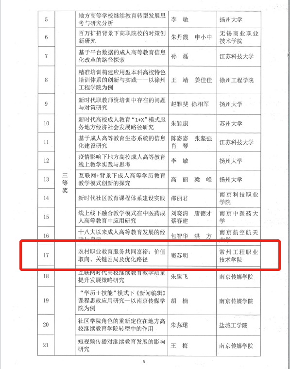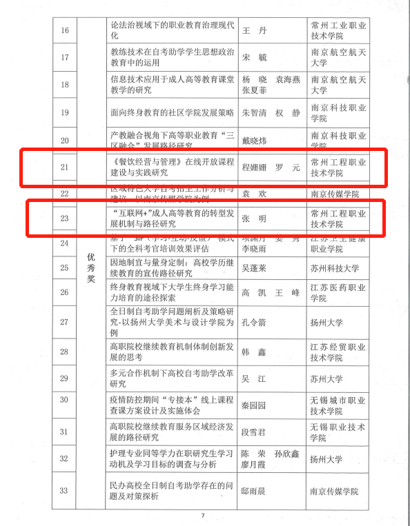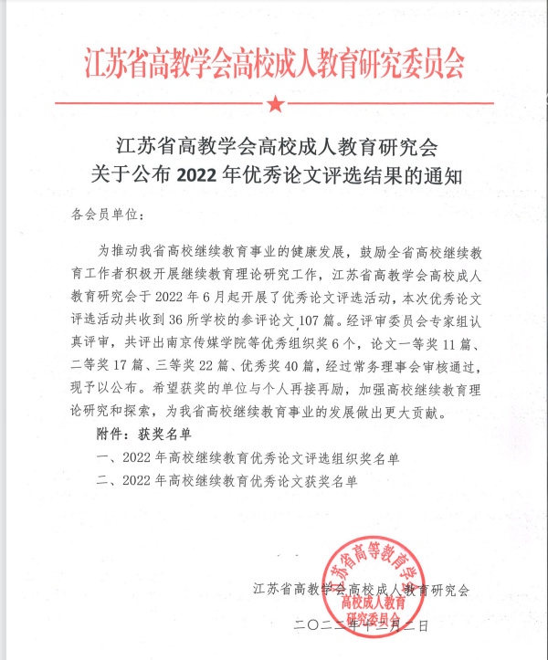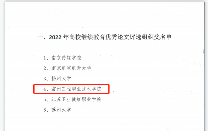 近日,江苏省高教学会高校成人教育研究会公布了2022年优秀论文评选结果。常州工程职业技术学院荣获2022年高校继续教育优秀论文评选组织奖。同时,学校报送3篇论文获优秀论文奖。其中,继续教育学院窦苏明撰写的《农村职业教育服务共同富裕:价值取向、关键困局及优化路径》获三等奖;经管学院程姗姗、罗元撰写的《“餐饮经营与管理”在线开放课程建设与实践研究》及张明的《“互联网+”成人高等教育的转型发展机制与路径研究》获优秀奖。