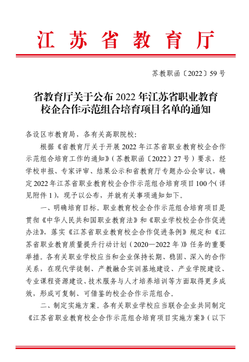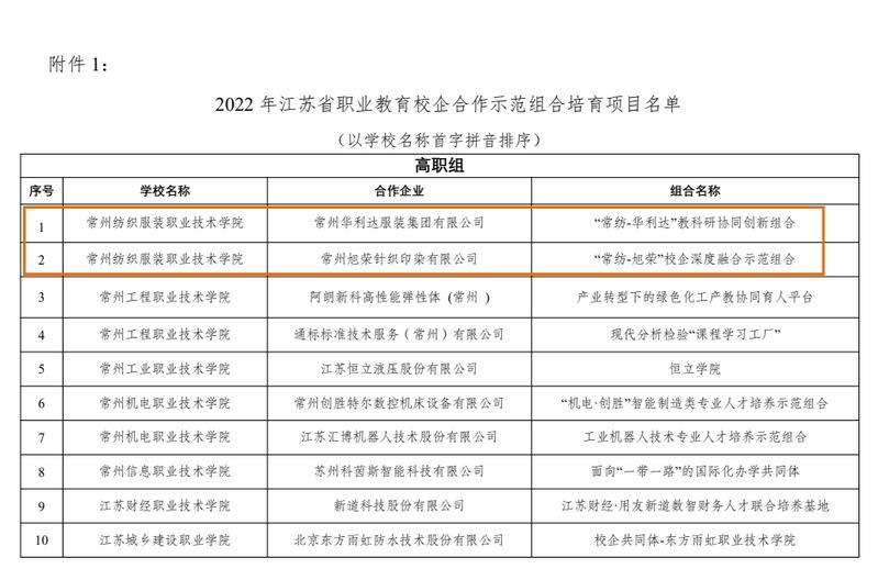 12月5日,江苏省教育厅正式发文(苏教职函〔2022〕59号),公布了2022年江苏省职业教育校企合作示范组合培育项目名单,常州纺织服装职业技术学院的服装学院与常州华利达服装集团有限公司合作申报项目“常纺-华利达”教科研协同创新组合、纺织学院与常州旭荣针织印染有限公司合作申报项目“常纺-旭荣”校企深度融合示范组合,在江苏省职业院校申报组合中脱颖而出,双双立项“江苏省职业教育校企合作示范组合培育项目”。 校企合作示范组合是职业院校和企业双方建立长期、稳固、深入的合作关系,在现代学徒制、产教融合实训基地建设、产业学院建设、专业课程资源建设、技术服务与人才培训等方面取得突出成效,具有示范和引领作用的学校和企业组合。 学校将以校企合作示范组合项目培育为契机,进一步积极拓展校企合作的深度和广度,发挥合作示范组合的引领作用,在人才培养、专业建设、技术创新、社会服务等方面创新性的开展工作,全面提升学校技术技能人才培养水平。