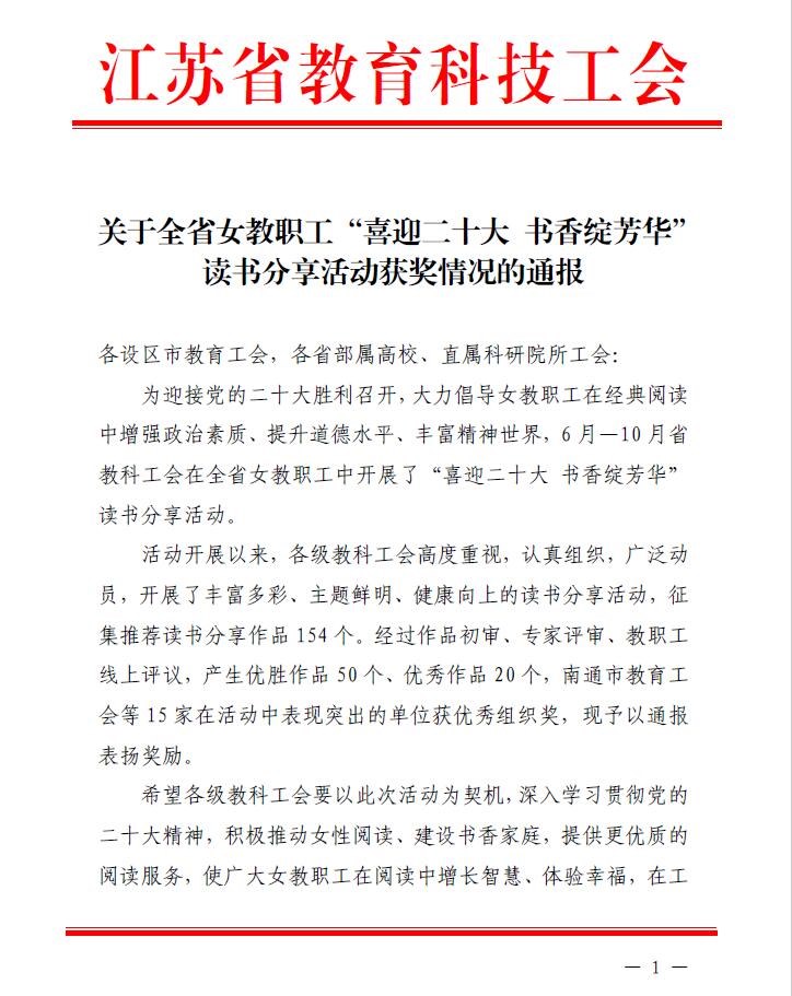 为迎接党的二十大胜利召开,大力倡导女教职工在经典阅读中增强政治素质、提升道德水平、丰富精神世界,积极营造爱读书、读好书、善读书的浓厚氛围。江苏省教育科技工会在全省女教职工中开展了“喜迎二十大 书香绽芳华” 读书分享活动,本次活动从6 月—10 月,在全省征集推荐读书分享作品 154 个。经过作品初审、专家评审、教职工线上评议,产生优胜作品 50 个、优秀作品 20 个。常州纺织服装职业技术学院车颖慧老师的作品“品人间词话,悟人生境界——读《人间词话>》有感”在本次读书分享活动中经过层层评审,荣获一等奖。