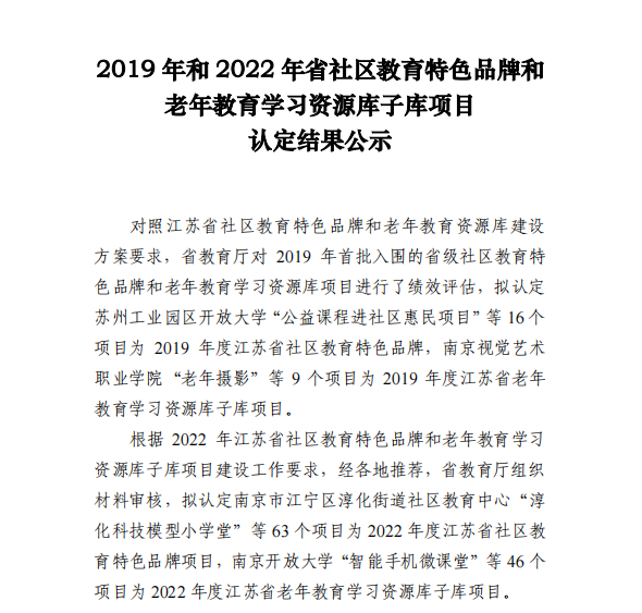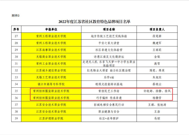 根据《省教育厅关于公布2019年和2022年省社区教育特色品牌和老年教育学习资源库子库项目认定结果的通知》(苏教继函〔2022〕1号),常州纺织服装职业技术学院申报的《常纺民艺工作坊》、《巧手编制 传承非遗》获得江苏省社区教育特色品牌项目。本次入选江苏省社区教育特色品牌项目共63项,其中入选2项的江苏高职院校有8所。