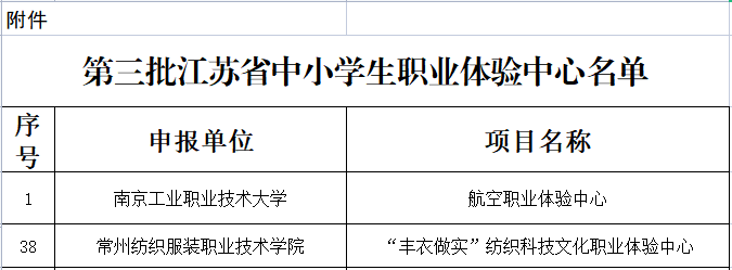近日,江苏省教育厅公布了第三批省级中小学生职业体验中心认定名单,经自我申报、市级推荐、省教育厅组织专家审核,确定常州纺织服装职业技术学院的“‘丰衣做实’纺织科技文化职业体验中心”为省级中小学生职业体验中心。