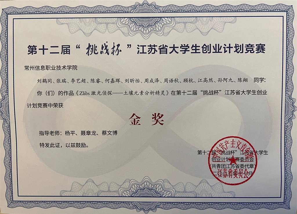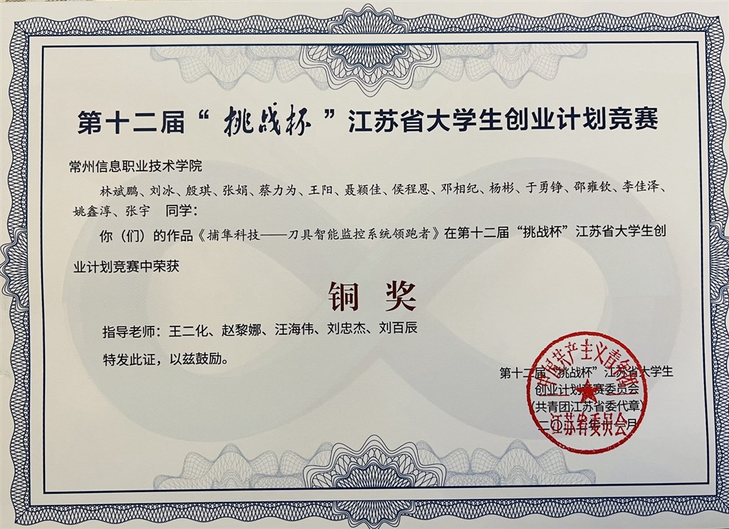 日前,共青团江苏省委、江苏省教育厅、江苏省人力资源和社会保障厅、江苏省科学技术协会、江苏省学生联合会联合发文《关于对第十二届“挑战杯”江苏省大学生创业计划竞赛结果的通报》(团苏委联〔2022〕19号),常州信息职业技术学院获“优胜杯”,2个项目获金奖,1个项目获铜奖,杨平、孙磊厚两位老师获“优秀指导教师”称号。