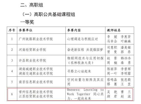 近日,2022年全国职业院校技能大赛教学能力比赛传来喜讯,常州信息职业技术学院大学外语部吴艳和曹兰团队与来自江苏经贸职业技术学院的教师代表,共同披荆斩棘、凯歌前行,凭借作品《Oneness: Learning to Work Together同心共力,一起向未来》荣获高职公共基础课程组一等奖。这也是学校继去年之后,再获全国职业院校技能大赛教学能力比赛一等奖,斩获两连冠。
