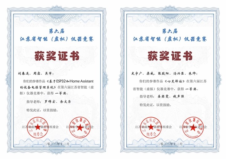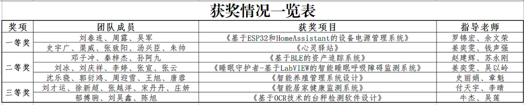 刘春连、周露、吴军 《基于ESP32和Home Assistant的设备电源管理系统》,史宇广、渠威、张致阳、汤兴臣、朱帅 《心灵驿站》获一等奖;邓子冲、秦梓杰、孙阿九 《基于BLE的资产追踪系统》,刘冰、刘庆祥、李婷、张宣、张云《睡眠守护者-基于LabVIEW的智能睡眠呼吸障碍监测系统》以及沈乐骁、郭衍鸿、周迎雪、王旭、唐蓉《智能养殖管理系统设计》获二等奖;刘才运、徐新超、张越洋、宋丹丹、庄妍《智能居家健康监测系统》,郁搏驹、刘吴鑫、陈旭《基于OCR技术的台秤检测软件设计》获三等奖。