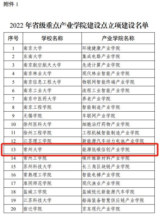 近日,江苏省教育厅发布《2022年省级重点产业学院建设点遴选结果的通知》(苏教高函〔2022〕18号),全省共立项建设第三批省级重点产业学院建设点20个,常州大学能源低碳信创产业学院成功入选。截至目前,学校共获批1个国家级现代产业学院(阿里云大数据学院)、3个省级重点产业学院(机器人产业学院、应急管理科学与工程学院、能源低碳信创产业学院)。