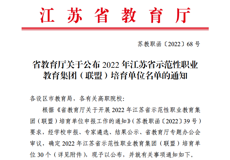 江苏省示范性职业教育集团(联盟)培育工作是江苏省深入贯彻落实党中央关于职业教育工作的决策部署和习近平总书记关于职业教育重要讲话精神,持续推进现代职业教育体系建设改革,优化职业教育类型定位,推动职业教育高质量发展的举措之一。本次共有30个职教集团入选江苏省示范性职业教育集团(联盟)培育单位。