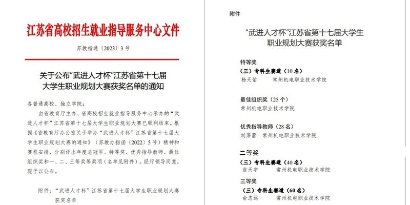 近日,由江苏省教育厅主办、省高校招生就业指导服务中心承办的“武进人才杯”江苏省第十七届大学生职业规划大赛总决赛落下帷幕。常州机电职业技术学院信息工程学院人工智能2031班学生杨天佑(指导老师:刘莱蕾)获专科生赛道特等奖,电气工程学院机器人2032班学生翁天宇(指导老师:王云霞)获二等奖,交通工程学院汽车营销2131班学生俞志远(指导老师:沈俊)获三等奖。学校获“最佳组织奖”,教师刘莱蕾获“优秀指导教师奖”。