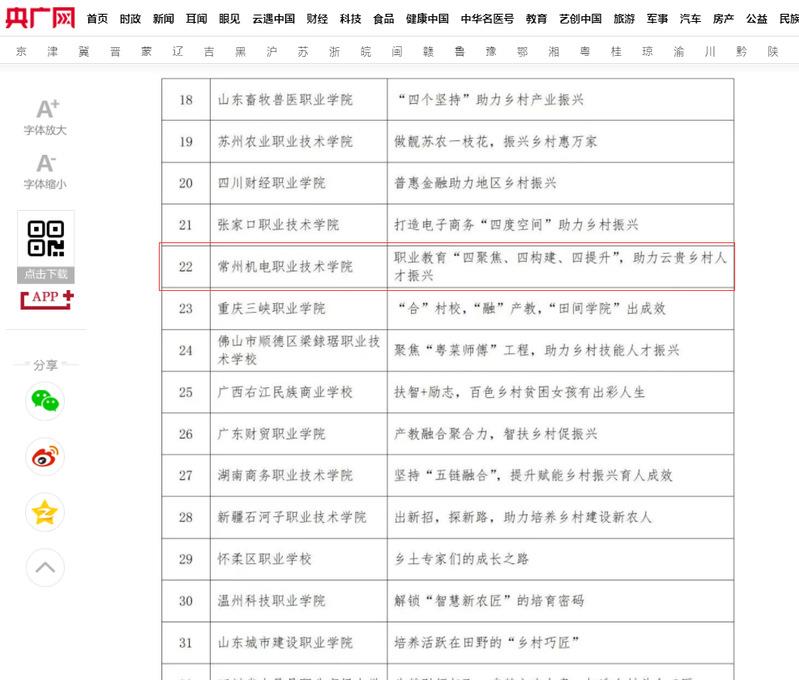 近日,中国职业技术教育学会乡村振兴与城市可持续发展工作委员会公布了职业教育服务乡村振兴典型案例,常州机电职业技术学院申报的《职业教育“四聚焦、四构建、四提升” 助力云贵乡村人才振兴》成功入选。