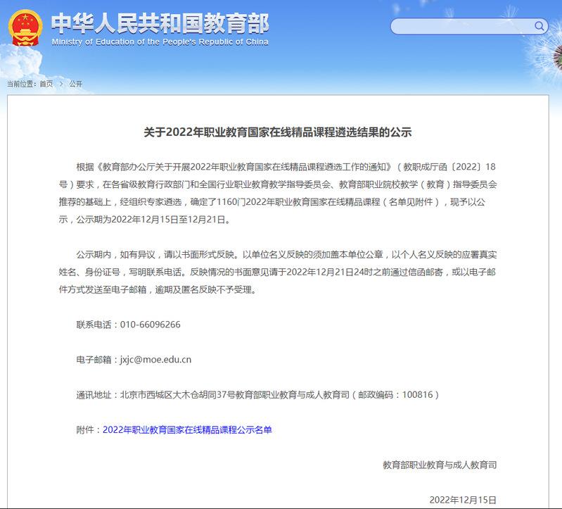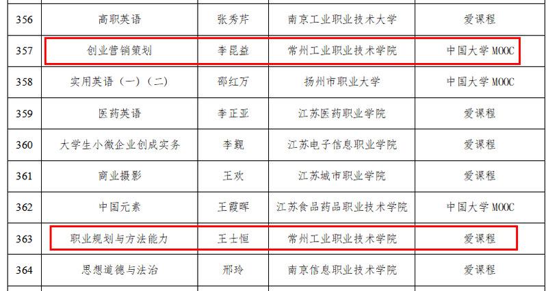 12月15日,教育部职业教育与成人教育司发布《关于2022年职业教育国家在线精品课程遴选结果的公示》,常州工业职业技术学院《创业营销策划》和《职业规划与方法能力》2门课程入选2022年职业教育国家在线精品课程公示名单。