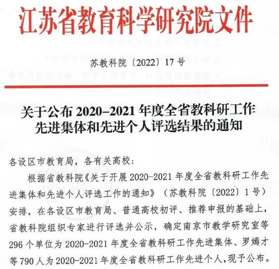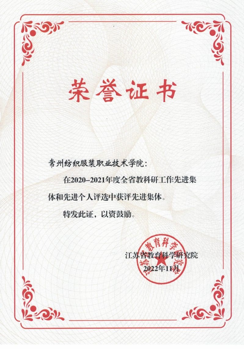 2022年6月12日,江苏省教育科学研究院发布了《关于公布2020-2021年度全省教科研工作先进集体和先进个人评选结果的通知》,常州纺织服装职业技术学院获评“教科研工作先进集体”。