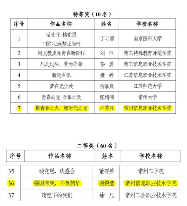 近日,由省委教育工委、省教育厅主办的“奋进新征程,青春勇担当”全省大学生征文比赛结果揭晓,常州信息职业技术学院获征文比赛特等奖1项、二等奖1项。