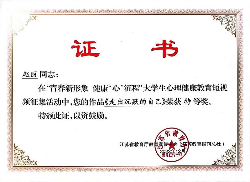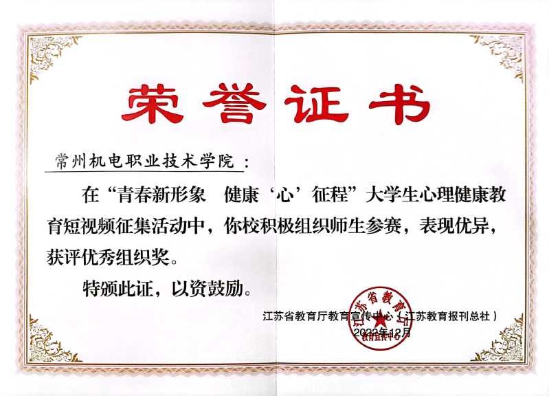 近日,由省教育厅教育宣传中心(江苏教育报刊总社)主办的“青春新形象 健康‘心’征程”大学生心理健康教育短视频征集活动评选结果公布。常州机电职业技术学院选送的作品获佳绩,其中,信息工程学院物联网2132班赵丽的作品《走出沉默的自己》(指导老师蔡蓉蓉)获特等奖,经济管理学院市场营销2132班冒思倩的作品《遇光》(指导老师冯超)获二等奖,学校获“优秀组织奖”。