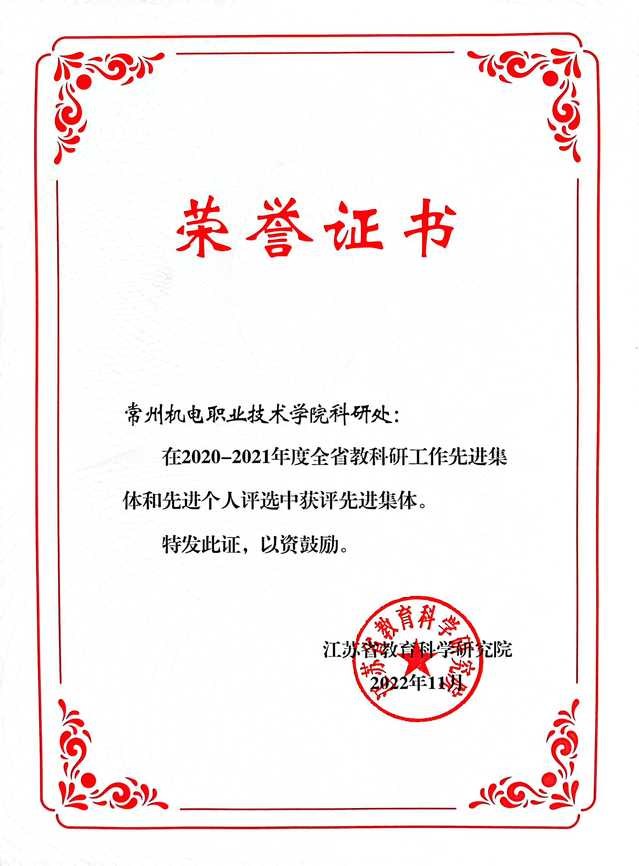 近日,江苏省教育科学研究院公布了2020—2021年度“江苏省教科研工作先进集体和先进个人”的名单,常州机电职业技术学院荣获省教科研先进集体荣誉称号,高职研究院研究员鲁武霞被评为省教科研先进个人。
