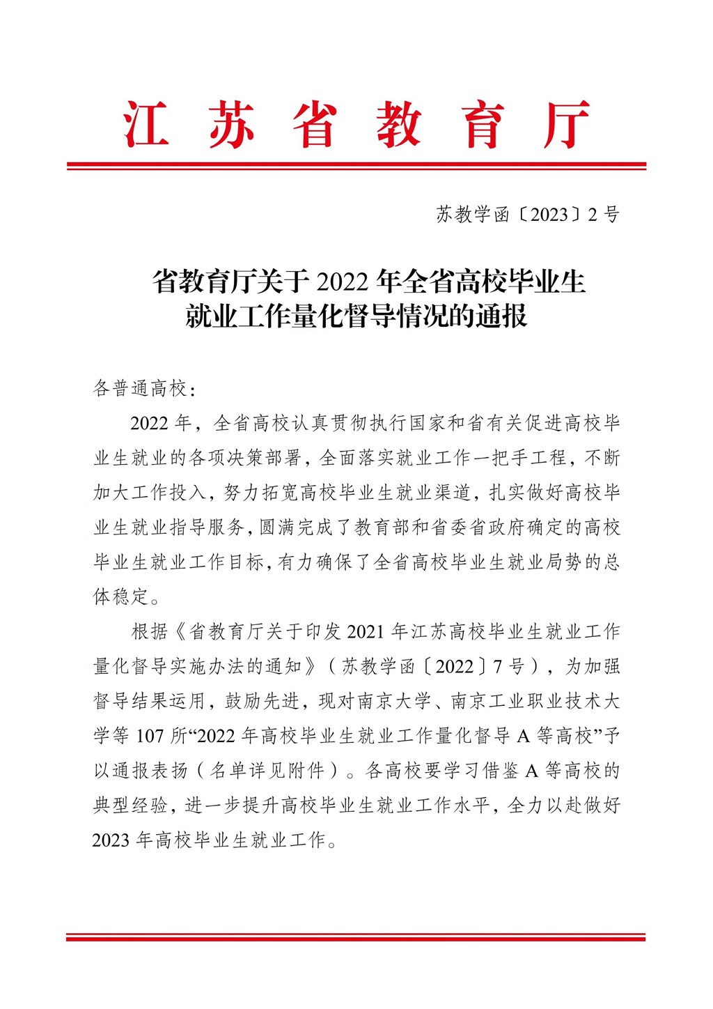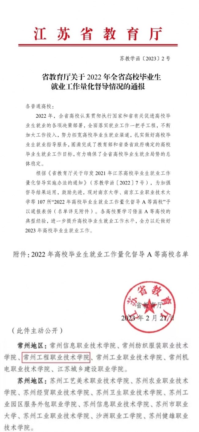近日,江苏省教育厅发布了《关于2022年全省高校毕业生就业工作量化督导情况的通报》,常州工程职业技术学院被评为江苏省“2022年高校毕业生就业工作量化督导A等高校”,这也是学校连续三年获得“A等高校”。
