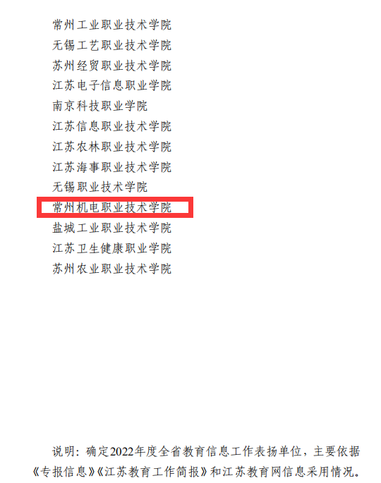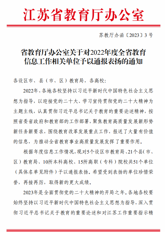 近日,省教育厅办公室发布《关于对2022年度全省教育信息工作相关单位予以通报表扬的通知》,对全省5个设区市教育局、21 个县(市、区)教育局、10所本科高校、15所高职(专科)院校共51个单位进行通报表扬,常州机电职业技术学院连续三年荣获“全省教育信息工作表扬单位”称号。