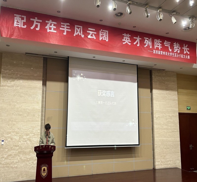 本次比赛以“聚甲基丙烯酸甲酯增韧”为主题,共分三天进行,选手通过配方设计及优化对聚甲基丙烯酸甲酯进行增韧改性。裁判委员会从技能操作、成本核算、产品性能三个方面综合评分。与本科院校专业代表队同台竞技,经过激烈角逐,脱颖而出,学校代表队最终以团体总分第一名的成绩,荣获此次比赛的特等奖,队长陈子洋同学受邀作为获奖代表发表获奖感言。