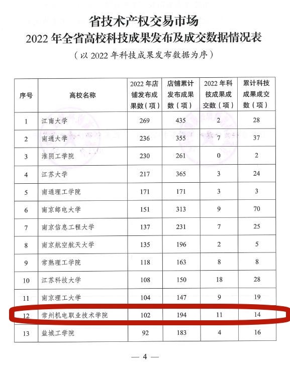 3月7日,由江苏省科技厅主办的2023年度江苏省技术转移工作总结会议在江苏省会议中心召开,发布了2022年全省高校技术转移工作成效相关数据。常州机电职业技术学院2022年发布科技成果102项,成交11项,获批产业副总7人、揭榜挂帅合作项目7项,科技成果发布及成交业绩位列全省高校第12位、全省高职院校首位。