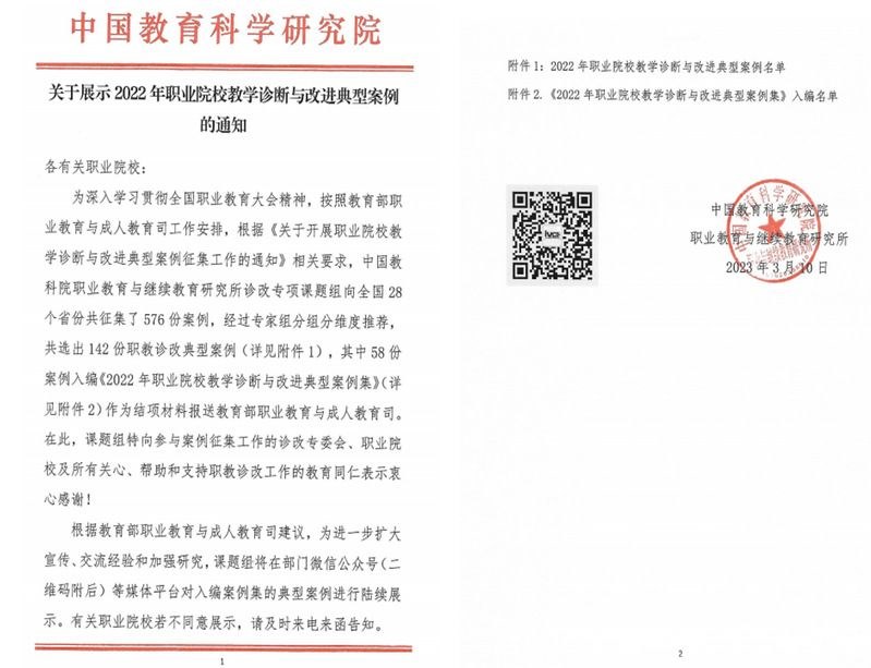 此次案例遴选由教育部职业教育与成人教育司委托中国教育科学研究院职业教育与继续教育研究所诊改专项课题组开展,旨在积极推进职业院校诊改创新发展,更好适应新时代、新阶段、新要求,鼓励职教诊改学校广泛交流经验,示范引领全国职教诊改工作创新发展,推动现代职业教育高质量发展。(审核:戎晓云、陈浩华、李颖、宫乃安)