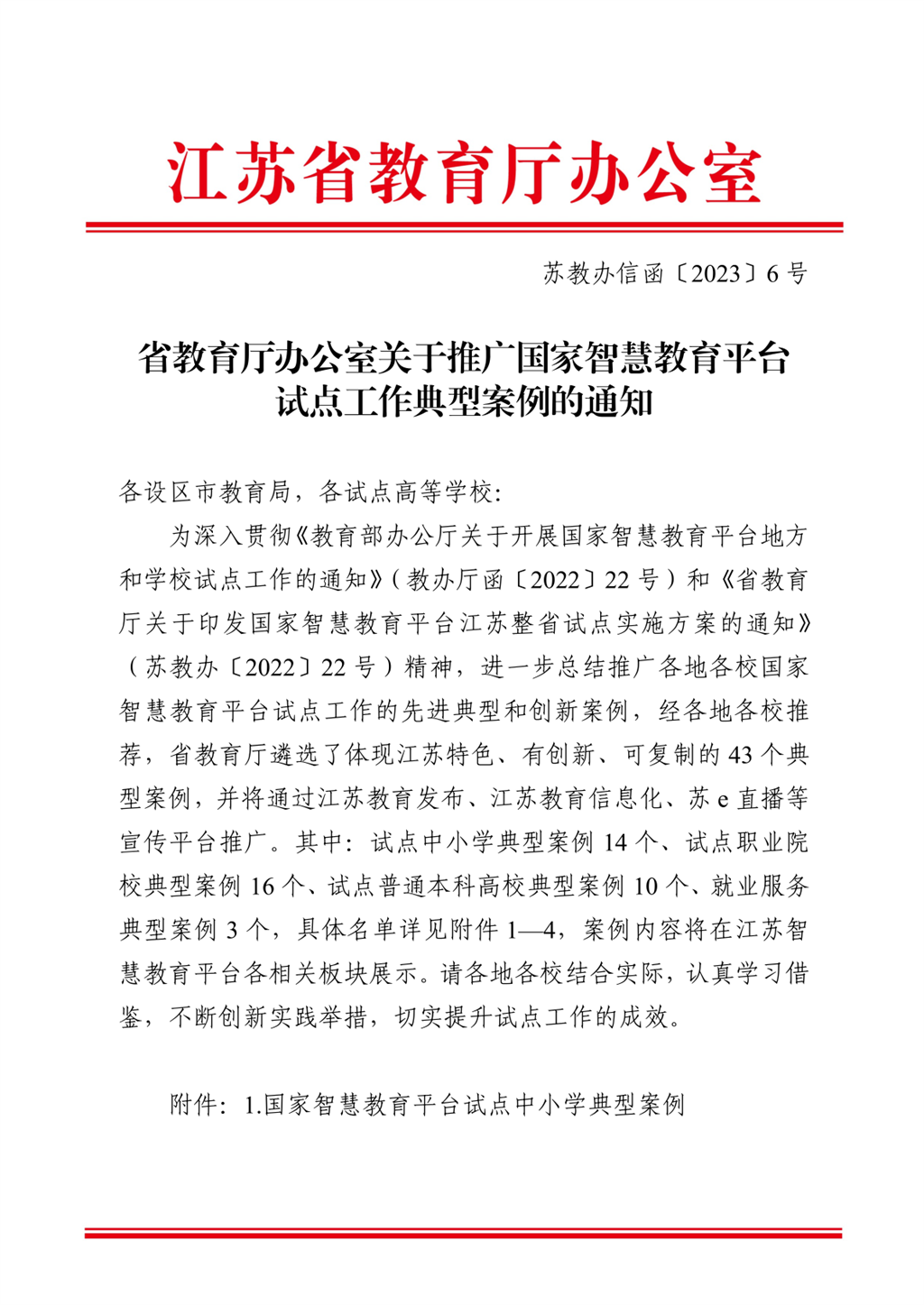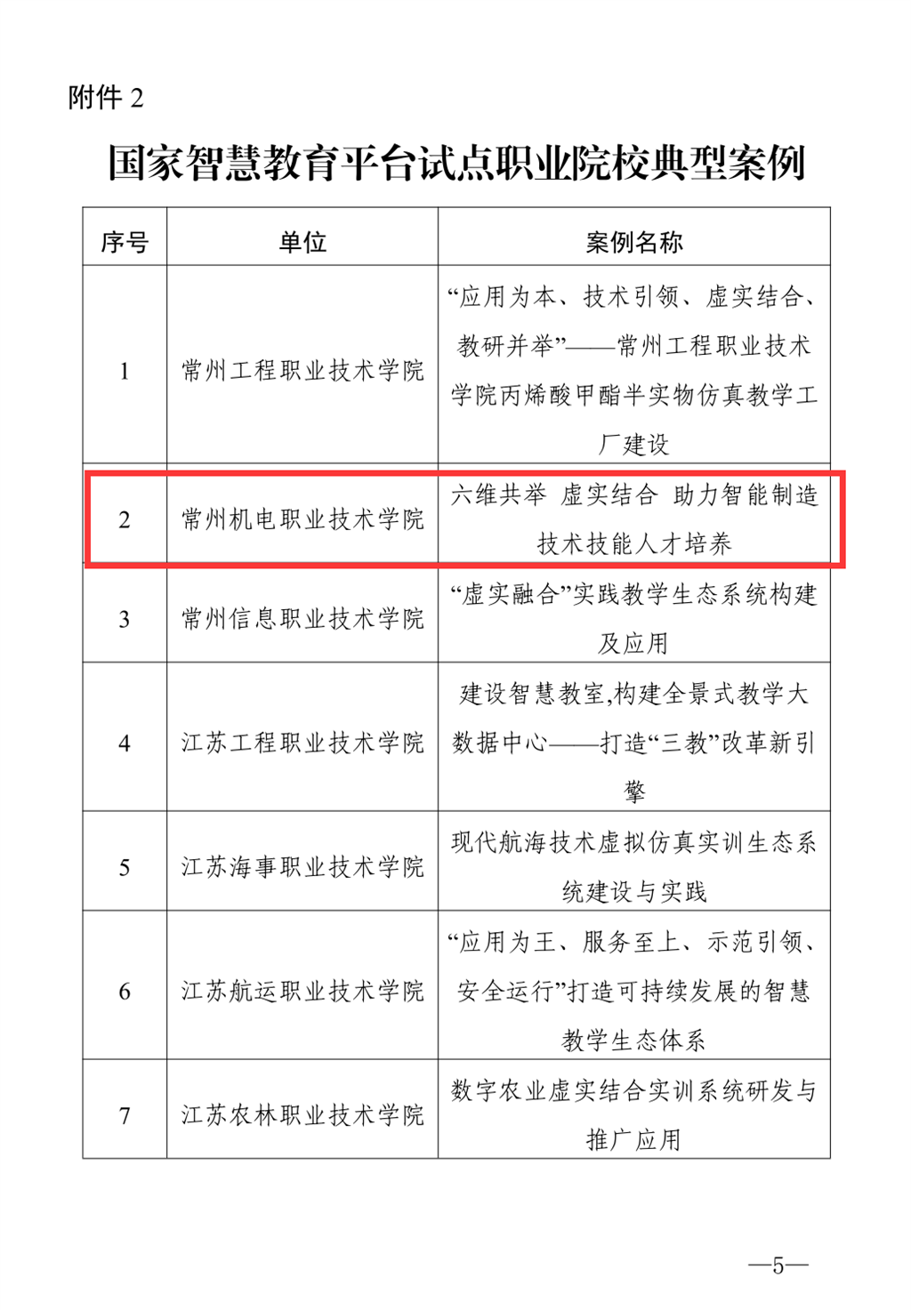 江苏省教育厅公布了《省教育厅办公室关于推广国家智慧教育平台试点工作典型案例的通知》(苏教办信函〔2023〕6 号),常州机电职业技术学院报送的《六维共举 虚实结合 助力智能制造技术技能人才培养》入选典型案例项目名单。