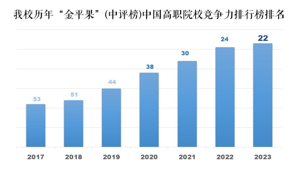 “金平果排行榜”(又称“中评榜”)由杭州电子科技大学中国科教评价研究院、浙江高等教育研究院等机构联合研发,被业界认为是反映我国高职高专院校办学情况最权威、最全面、最专业的榜单之一。较榜单2022年发布结果,今年学校全国综合排名上升2位,综合竞争力继续位居全省第3、在常高职院校第1。(文/吴昊审/吴云飞、李春华、张煜)