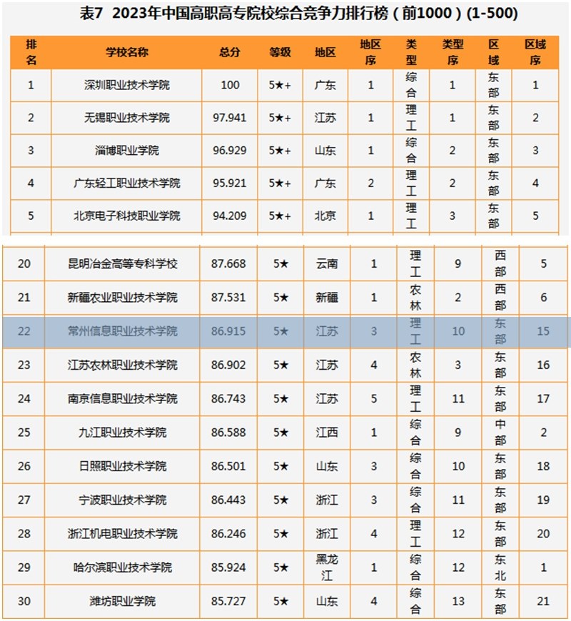 日前,“金平果”(中评榜)2023中国高职院校竞争力排行榜发布,常州信息职业技术学院排名全国第22,再创历史新高,实现6连升。