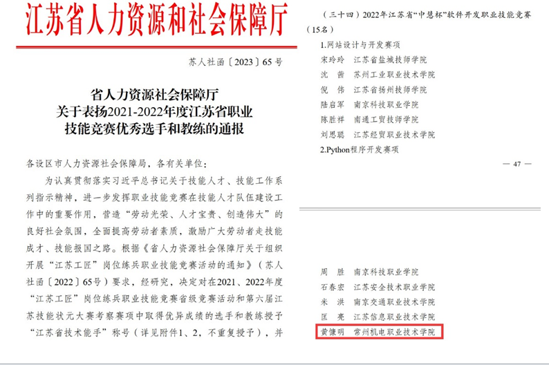 3月21日,江苏省人力资源社会保障厅发布了《省人力资源社会保障厅关于表扬2021-2022年度江苏省职业技能竞赛优秀选手和教练的通报》(苏人社函〔2023〕65 号),常州机电职业技术学院教师黄慷明在2022年度“江苏工匠”岗位练兵职业技能竞赛省级竞赛活动中取得优异成绩,并被授予“江苏省技术能手”称号。