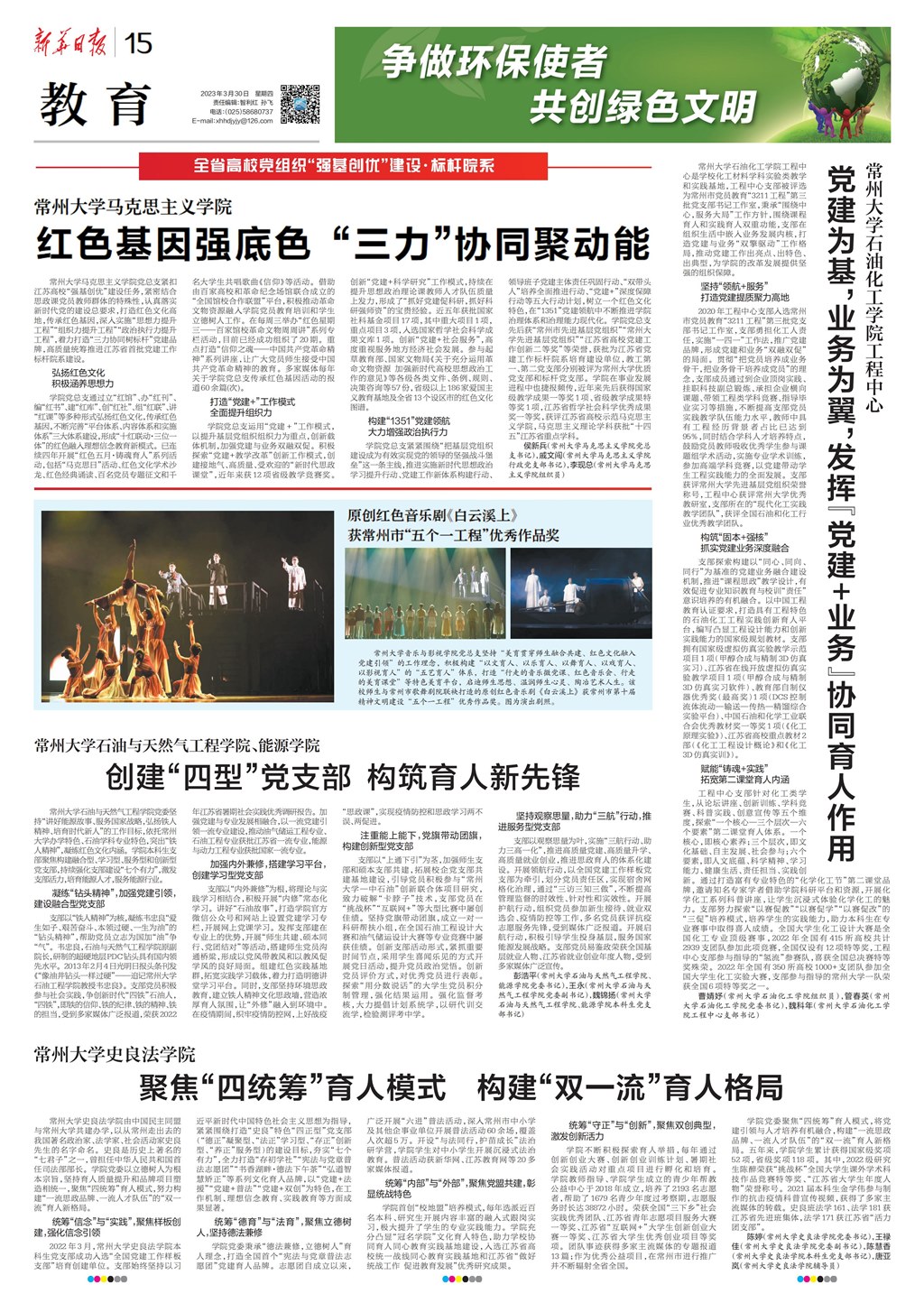 3月30日,《新华日报》整版聚焦常州大学基层党建工作,分别以《红色基因强底色,“三力”协同聚动能》《党建为基,业务为翼,发挥“党建+业务”协同育人作用》《着力创建四型党支部,构筑石工育人新先锋》《聚焦“四统筹”育人模式,构建“双一流”育人格局》为题,详细报道我校马克思主义学院,石油化工学院,石油与天然气工程学院 能源学院,史良法学院等全省党建工作标杆院系和全国党建样板支部特色做法和经验成效。