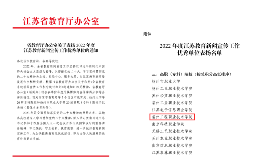 日前,江苏省教育厅办公室发布《关于表扬2022年度江苏教育新闻宣传工作优秀单位的通知》,结合各单位年度厅属媒体内容保障得分和综合评价情况,对5个设区市教育局、20所本科院校和20所高职(专科)院校予以表扬。常州工程职业技术学院获评2022年度“江苏教育新闻宣传工作优秀单位”,自2018年以来,学校已连续5年获省教育厅表彰。
