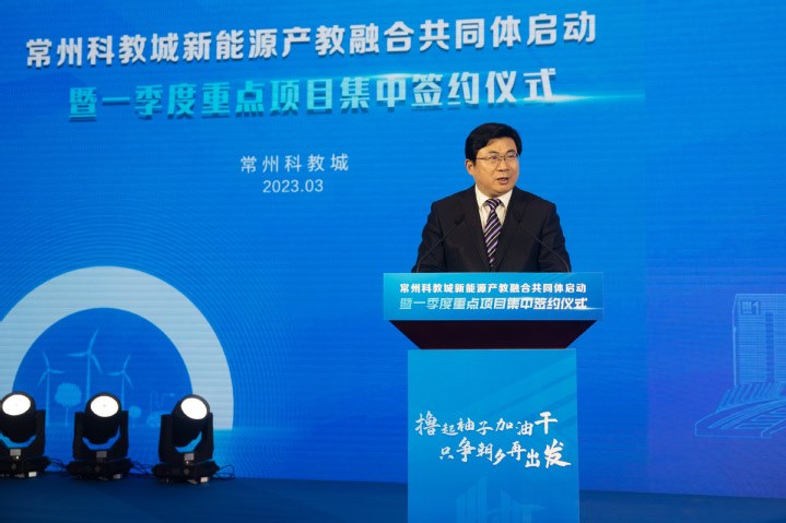 3月30日,常州科教城新能源产教融合共同体启动暨一季度重点项目集中签约仪式在常州长江龙城酒店举行。常州市委常委、武进区委书记、科教城党工委书记乔俊杰出席活动并讲话,市政协副主席、科教城管委会主任祝正庆主持签约活动。