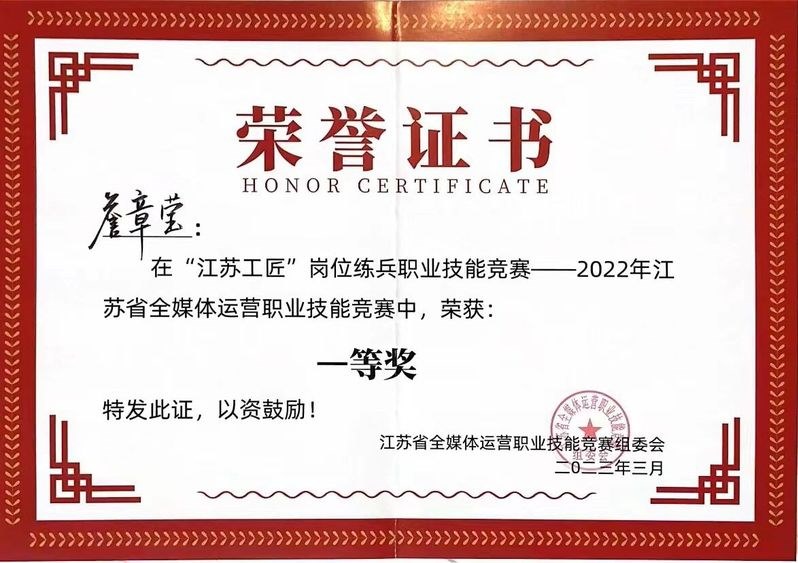 3月28日,由江苏省人力资源和社会保障厅举办的“江苏工匠”岗位练兵职业技能竞赛活动——2022年江苏省全媒体运营职业技能总决赛在江苏南通举行。常州工业职业技术学院数字商务学院国际商务专业20商务331班学生詹章莹获全省总决赛一等奖、季羽彤获三等奖。