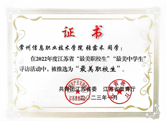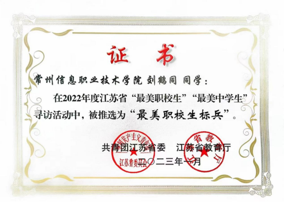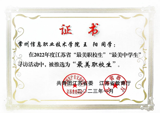 近日,共青团江苏省委和省教育厅联合开展的2022年度江苏省“最美职校生”寻访活动结果揭晓。 常州信息职业技术学院刘鹤同同学获江苏省“最美职校生标兵”荣誉称号,张露禾、王阳同学获江苏省“最美职校生”荣誉称号。