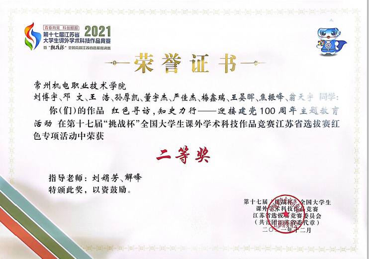 近日,在江苏省教育厅举办的2022年“苏乡永助”资助育人主题活动中,经申报、审核、专家初评和终评,常州机电职业技术学院电气工程学院翁天宇同学获评“江苏学生资助宣传大使”、邓文同学获评“江苏励志成才之星提名奖”,模具技术学院尹湘同学的两幅作品分别获高校硬笔组一等奖和高校软笔组二等奖的好成绩。