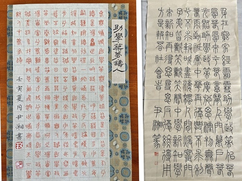 尹湘同学,他的两幅作品皆节选自张绪麟先生的诗《助学?筑梦?铸人》,歌颂的是国家资助工作。“助学,筑梦,铸人”是国家出台给予千万学生一展鸿鹄之志的政策,表明国家也正不断激励着青年大学生的成长。