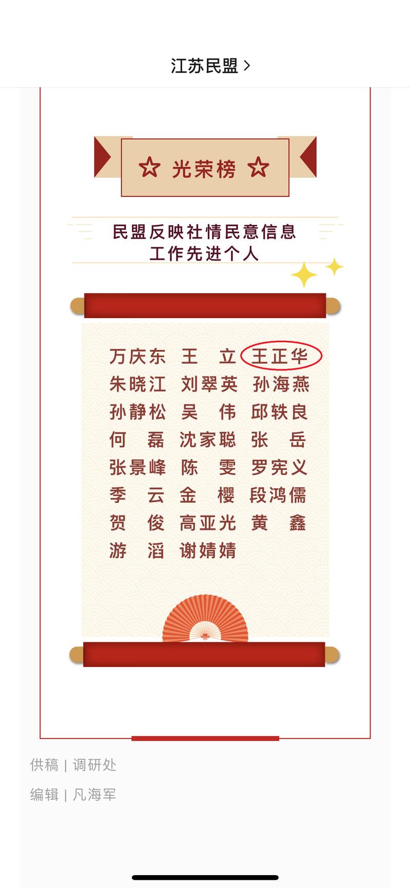 4月7日,民盟中央2023年参政议政工作会议在北京召开。会议对2022年度民盟参政议政工作及反映社情民意信息工作先进单位和个人等进行了表彰。民盟中央副主席张道宏出席会议并讲话。民盟中央副秘书长张峰出席会议并宣读表彰决定、作闭幕讲话。民盟中央参政议政部副部长袁铨主持会议。常州工业职业技术学院民盟支部盟员王正华获民盟中央“反映社情民意信息工作先进个人”表彰。