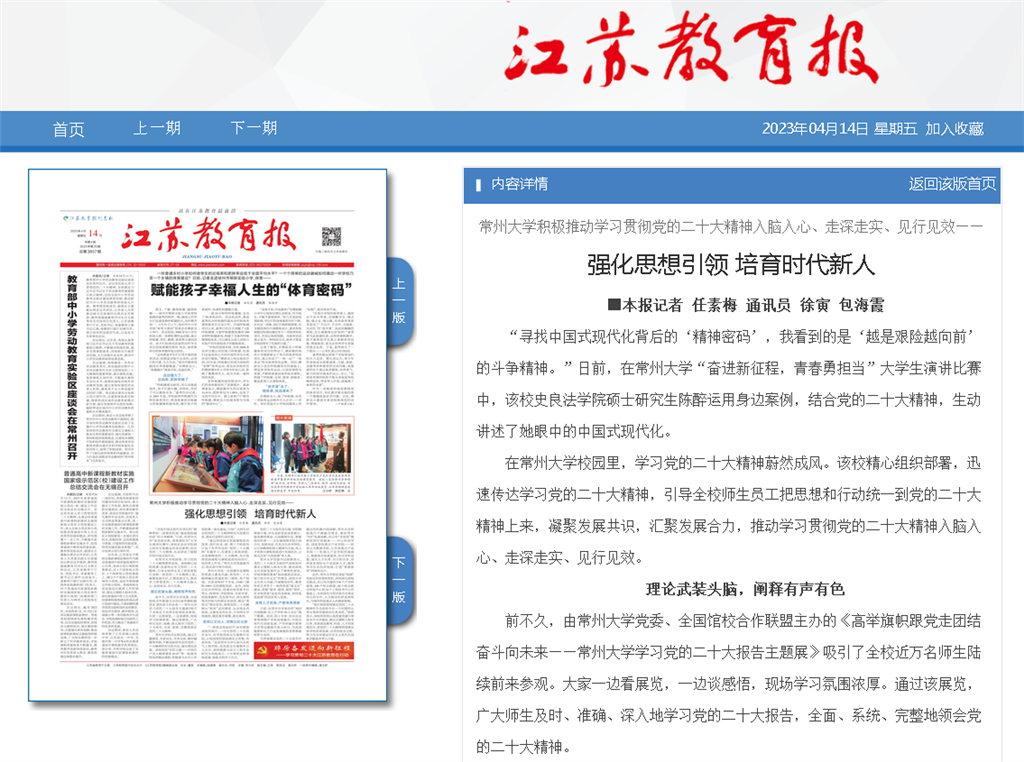 4月14日,《江苏教育报》头版“踔厉奋发建功新征程”专栏以《强化思想引领 培育时代新人》为题,从“理论武装头脑,阐释有声有色”“坚持以文化人,润育出彩出新”“发挥人才优势,产教常亮常新”等方面报道常州大学精心组织部署,迅速传达学习党的二十大精神,推动学习贯彻党的二十大精神入脑入心、走深走实、见行见效。全文如下: