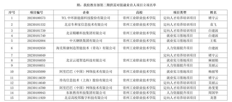 近日,教育部高校学生司公布了第二期供需对接就业育人项目立项名单,常州工业职业技术学院申报的15项就业育人项目获批立项,其中包括定向人才培养培训项目7项,就业实习基地项目5项,人力资源提升项目3项。