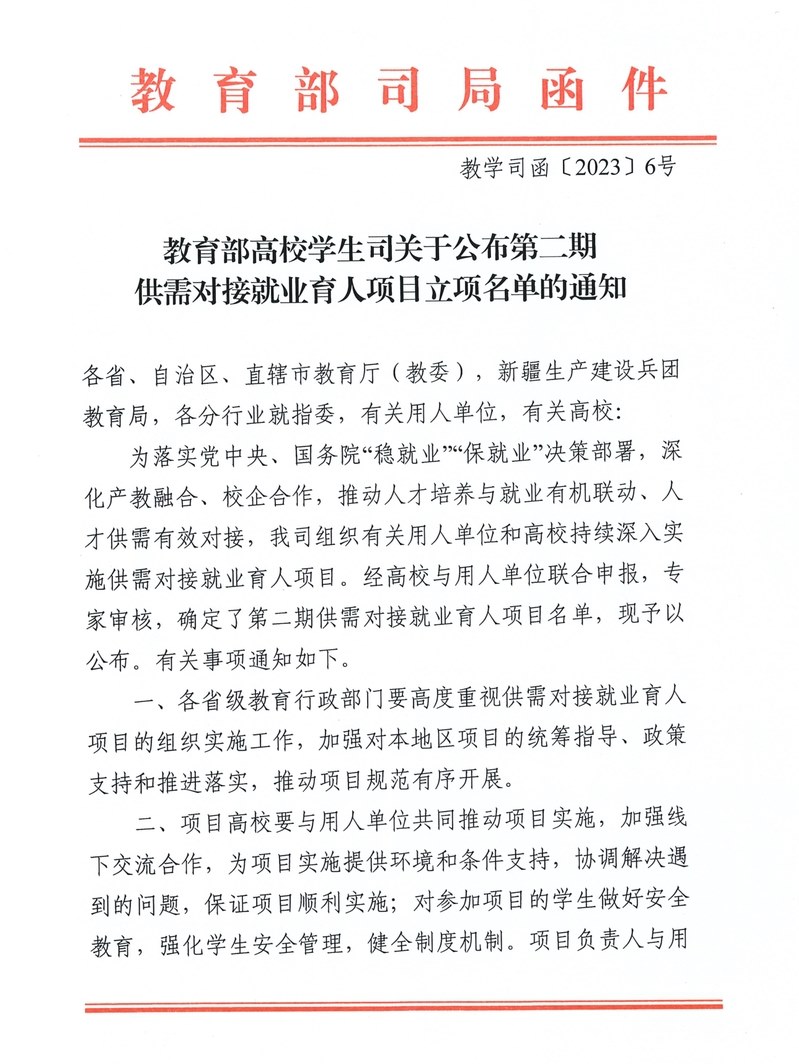 供需对接就业育人项目是教育部贯彻落实党中央、国务院“稳就业”“保就业”决策部署的举措之一,旨在深化高等教育改革,推动就业与培养有机联动、人才供需有效对接。本次学校获批教育部供需对接就业育人项目,为学校深化产教融合、校企合作,推动人才培养与就业有机联动、人才供需有效对接增加了新途径。