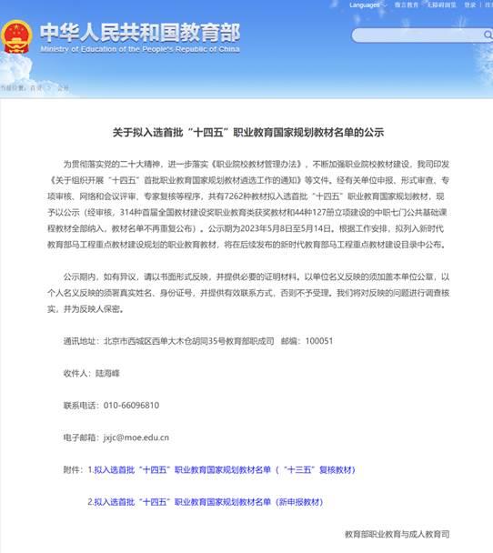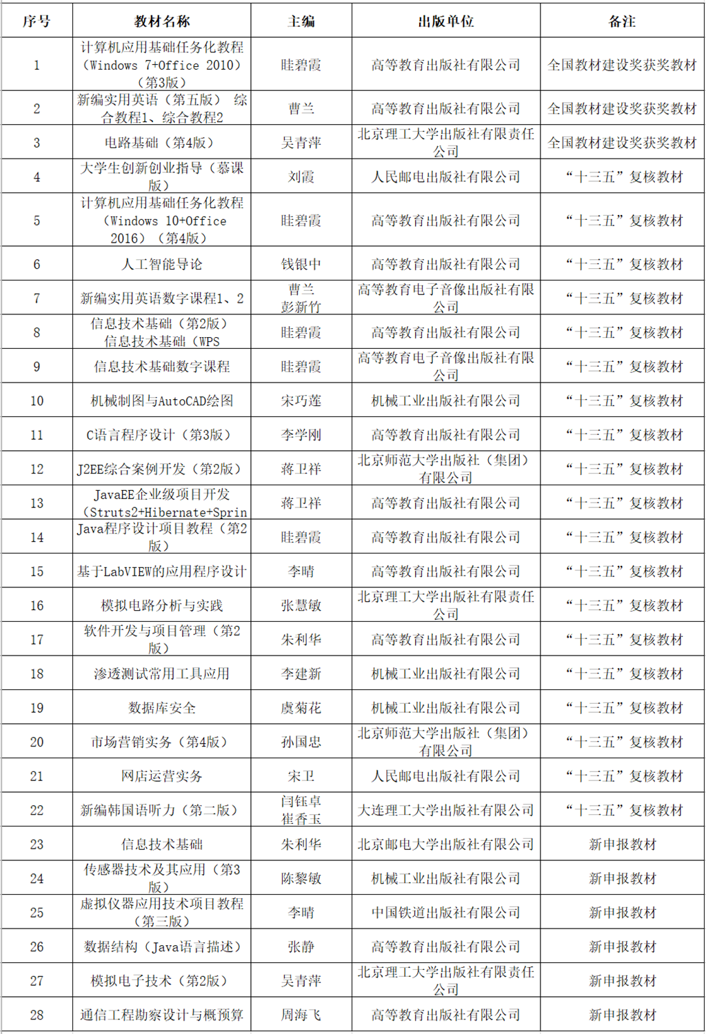 近日,教育部发布了《关于拟入选首批“十四五”职业教育国家规划教材名单的公示》。公示显示共有7262种教材拟入选首批“十四五”职业教育国家规划教材。常州信息职业技术学院3部首届全国教材建设奖职业教育类获奖教材、19部“十三五”职业教育国家规划教材及6部新申报教材入选,入选教材总量居江苏省高职院校第4位。(文/吴睿 审/朱敏、吴昊、张煜)