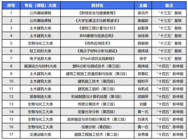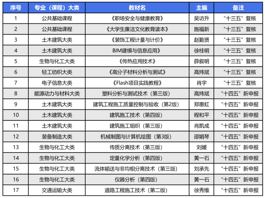 近日,教育部发布《关于拟入选首批“十四五”职业教育国家规划教材名单的公示》,对拟入选首批“十四五”职业教育国家规划教材的7262种教材进行公示,常州工程职业技术学院17部教材榜上有名,其中“十三五”复核教材7本、新申报入选教材10本,新申报教材入选“十四五”职业教育国家规划教材数位居全国高职院校第14位、江苏省高职院校第1位。