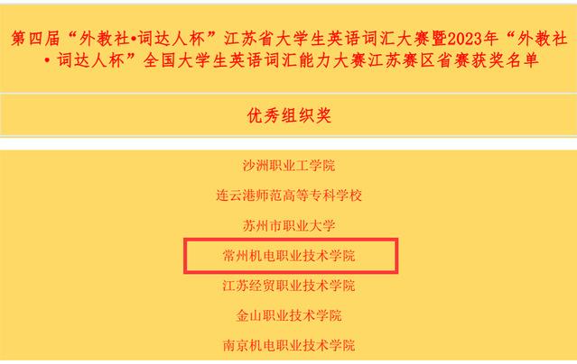 5月13日,2023“外教社·词达人杯”全国大学生英语词汇能力大赛江苏赛区决赛如期举行,常州机电职业技术学院蔡玲玲老师指导的机制2231班的祁申洋同学获得江苏赛区特等奖。周延超、蔡洋航、朱海成、周隽玮、陈祺宇、梅婷等6位同学获得江苏赛区一等奖,指导教师分别为郑云娟、沈洁、朱金凤、王小娟、程菁、赵雪。另外有34位同学分获二、三等奖,共有7位同学入围国赛。本次大赛入围国赛及获奖人数均居常州高职院校第一,由于出色的组织工作,学校获优秀组织奖。