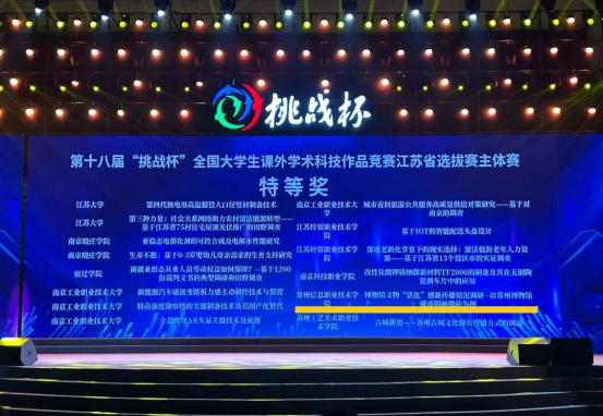 5月26日至28日,第十八届“挑战杯”全国大学生课外学术科技作品竞赛江苏省选拔赛决赛在常州大学举行。常州信息职业技术学院共有3项作品入围主体赛,4项作品入围黑科技专项赛。由学校教师王亦非、陈维艳、杨会指导的项目《博物馆文物“ 活化 ” 创新传播情况调研——以常州博物馆藏南朝画像砖为例》获主体赛特等奖。在该赛项中,学校取得了“入围省赛项目数量创历史新高”,“荣获省赛奖项级别创历史新高”2项历史性突破。